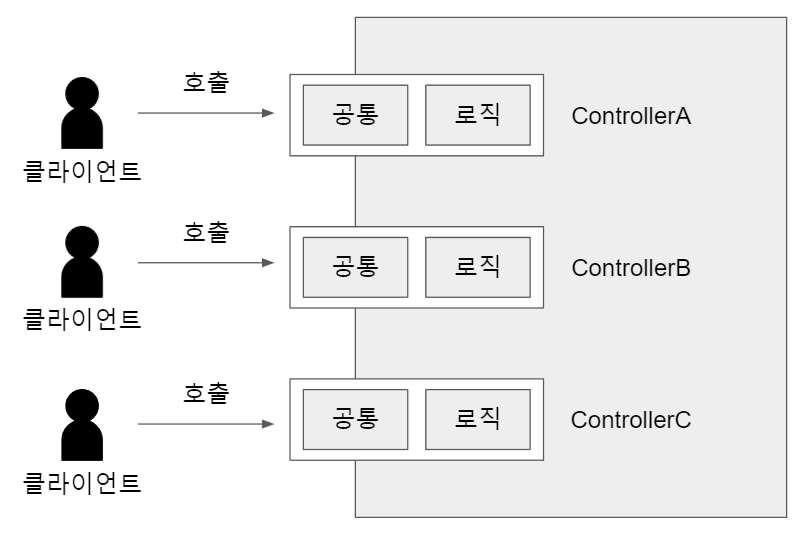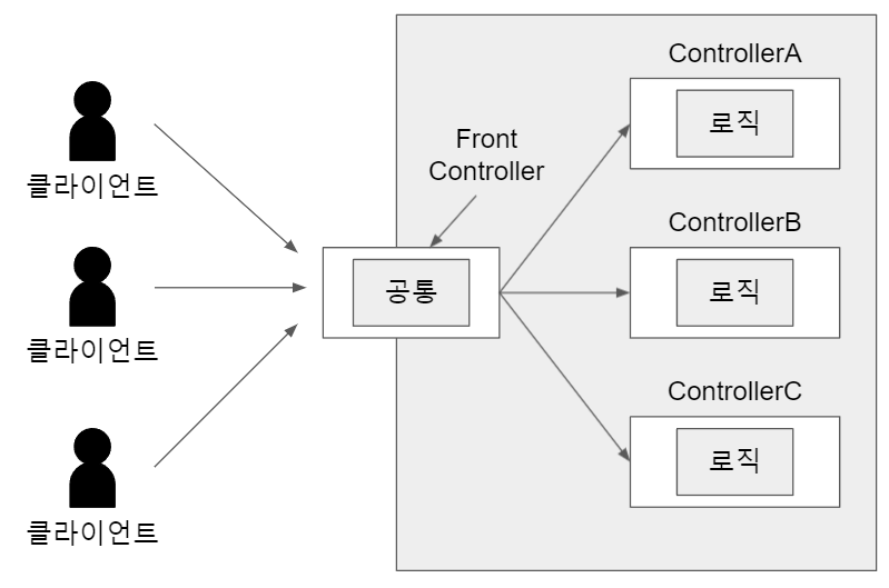 클라이언트들이 각 Controller를 호출하는게 아니라 Front Controller에 요청을 보내고 Front Controller가 각 요청에 맞는 컨트롤러를 찾아서 호출하는 패턴