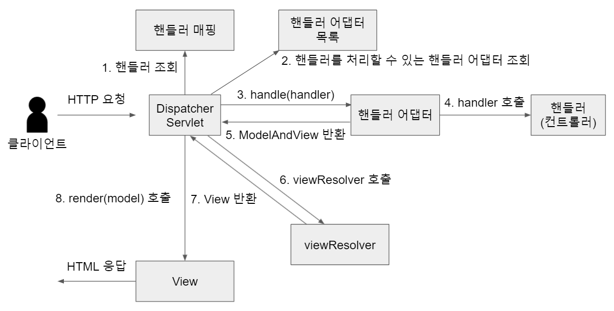 * HandlerMapping, HandlerAdapter 모두 순서대로 찾고 없으면 다음 순서로 넘어간다