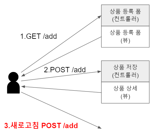이 상태에서 새로 고침을 선택하면 마지막에 전송한 POST /add + 상품 데이터를 서버로 다시 전송하게