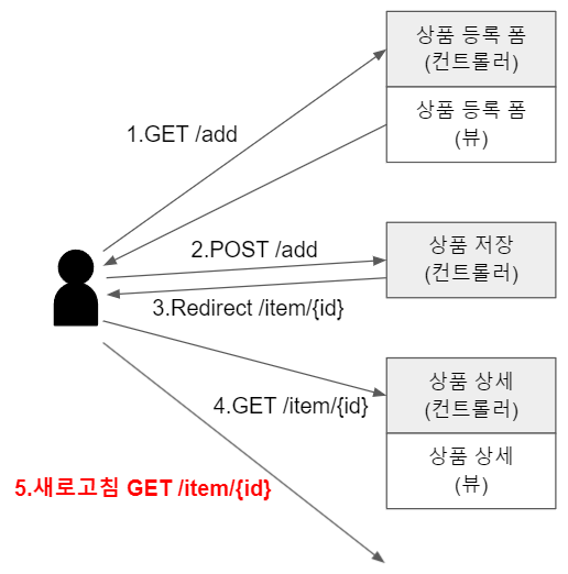 웹 브라우저는 리다이렉트의 영향으로 상품 저장 후에 실제 상품 상세 화면으로 다시 이동한다